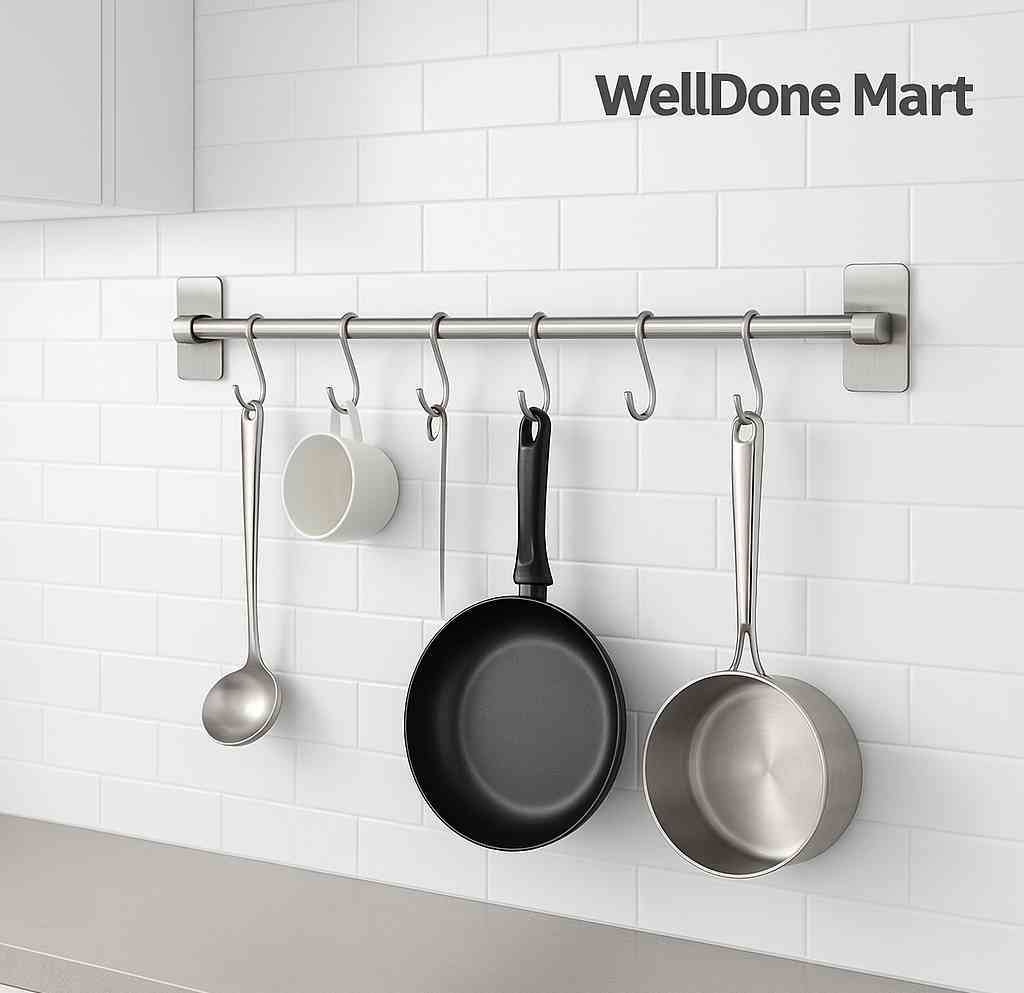 Keep your kitchen neat and stylish with this durable Stainless Steel Kitchen Hanger. Designed with 6 sturdy hooks, it’s perfect for hanging utensils like ladles, cups, frying pans, strainers, and saucepans. The sleek and rust-resistant build makes it both functional and long-lasting.