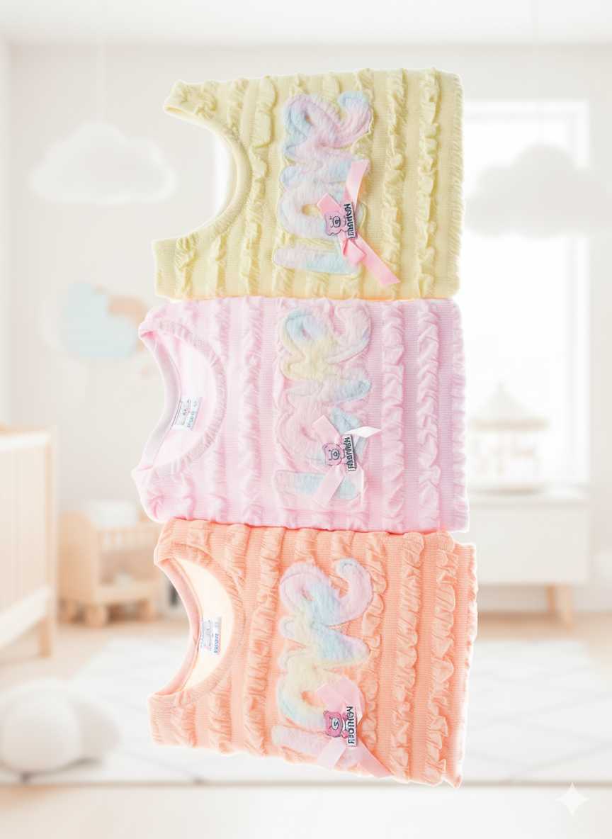 The charming textured design is available in pink, orange, and yellow, offering a splash of color for every preference. The set features a beautiful "LOVE" print, adding a touch of sweetness that will make your child feel special. The set includes a long-sleeve top and matching pyjama bottoms, both featuring a snug fit that allows for easy movement. The elastic waistband on the bottoms ensures they stay securely in place without being too tight, providing a perfect fit as your child grows.